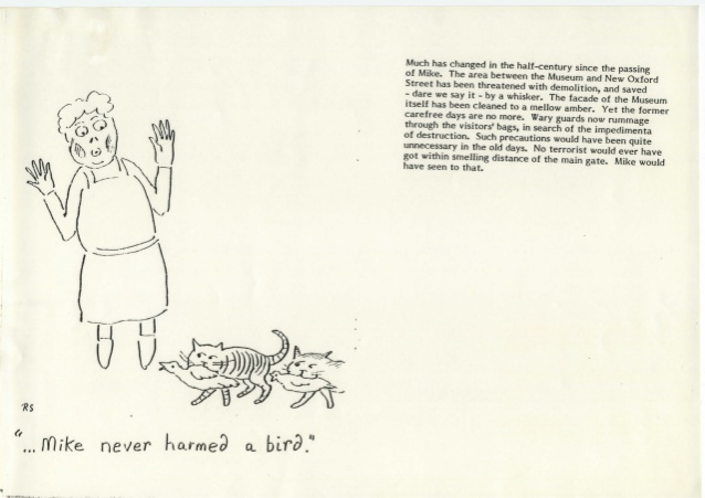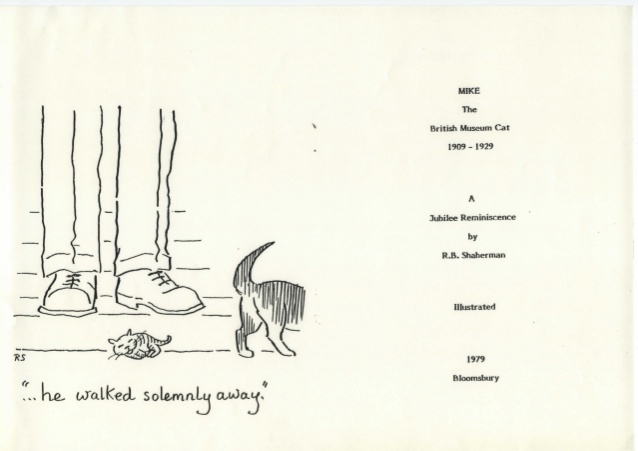 Toda su historia, incluyendo detalles adicionales, fue relatada tras su muerte precisamente por aquel Sir E. A. Wallis, que si recordáis fue el primero en verlo cuando lo trajo Black Jack, en un librillo de 16 páginas que publicó con un título casi idéntico: “Mike, The cat who assisted in keeping the Main Gate of the British Museum from February 1909 to January 1929» (Mike, El gato que ayudó a guardar la entrada principal del Museo Británico desde febrero de 1909 a enero de 1929).